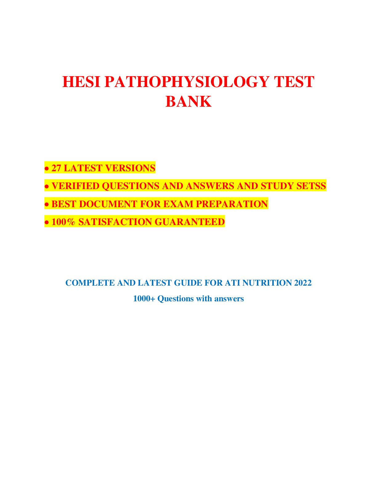 Pathophysiology > HESI > HESI PATHOPHYSIOLOGY TEST BANK 27 LATEST VERSIONS VERIFIED QUESTIONS AND ANSWERS AND STUDY SETSS BEST DOCUMENT FOR EXAM PREPARATION 100% SATISFACTION GUARANTEED COMPLETE AND LATEST GUIDE FOR ATI NUTRITION 2022 1000+ Questions with answers Hesi Pathophysiology Practice Exam Questions with answers, rated A. 2022/2023 (All)