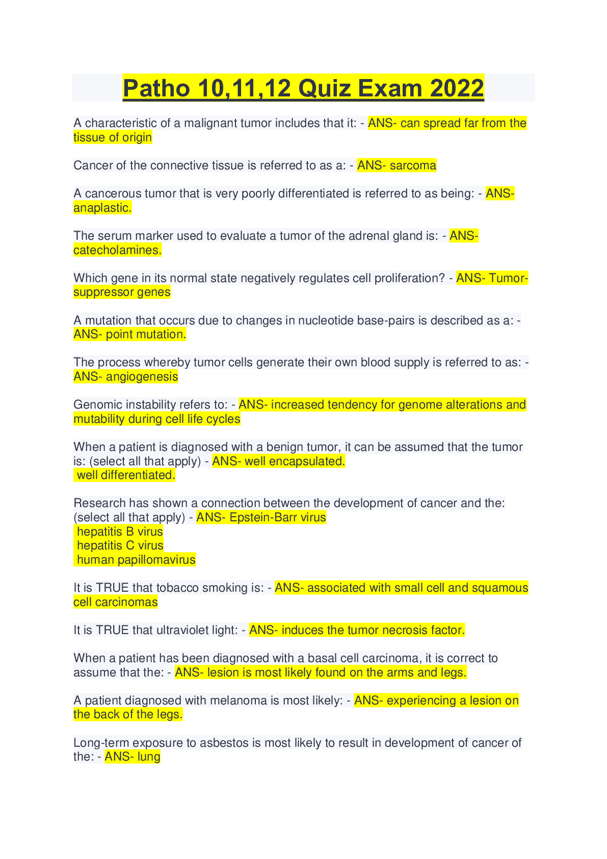 Pathophysiology > EXAMs > Patho 10,11,12 Quiz Exam 2022 (All)
