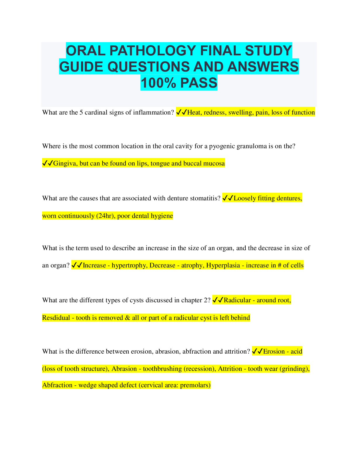 Pathophysiology > QUESTIONS & ANSWERS > ORAL PATHOLOGY FINAL STUDY GUIDE QUESTIONS AND ANSWERS 100% PASS (All)