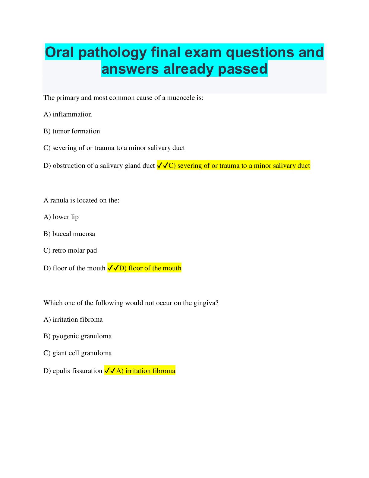 Pathophysiology > QUESTIONS & ANSWERS > Oral pathology final exam questions and answers already passed (All)