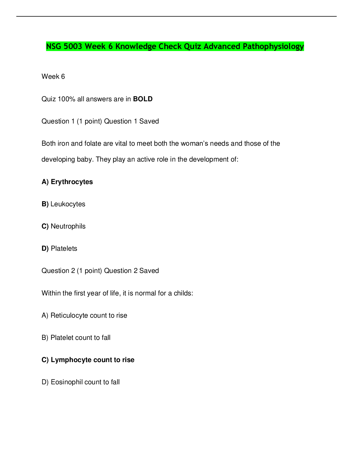 Pathophysiology > EXAM > NURS 6501N ADVANCED PATHOPHYSIOLOGY 100 QUESTIONS AND ANSWERS (100 % CORRECT) (All)