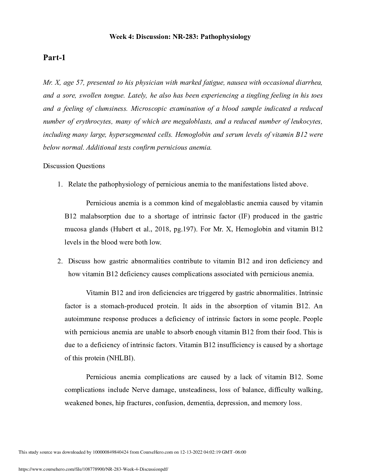 Pathophysiology > DISCUSSION POST > NR 283 Week 4 Discussions: Mr. X, age 57, presented to his physician with marked fatigue…) (All)