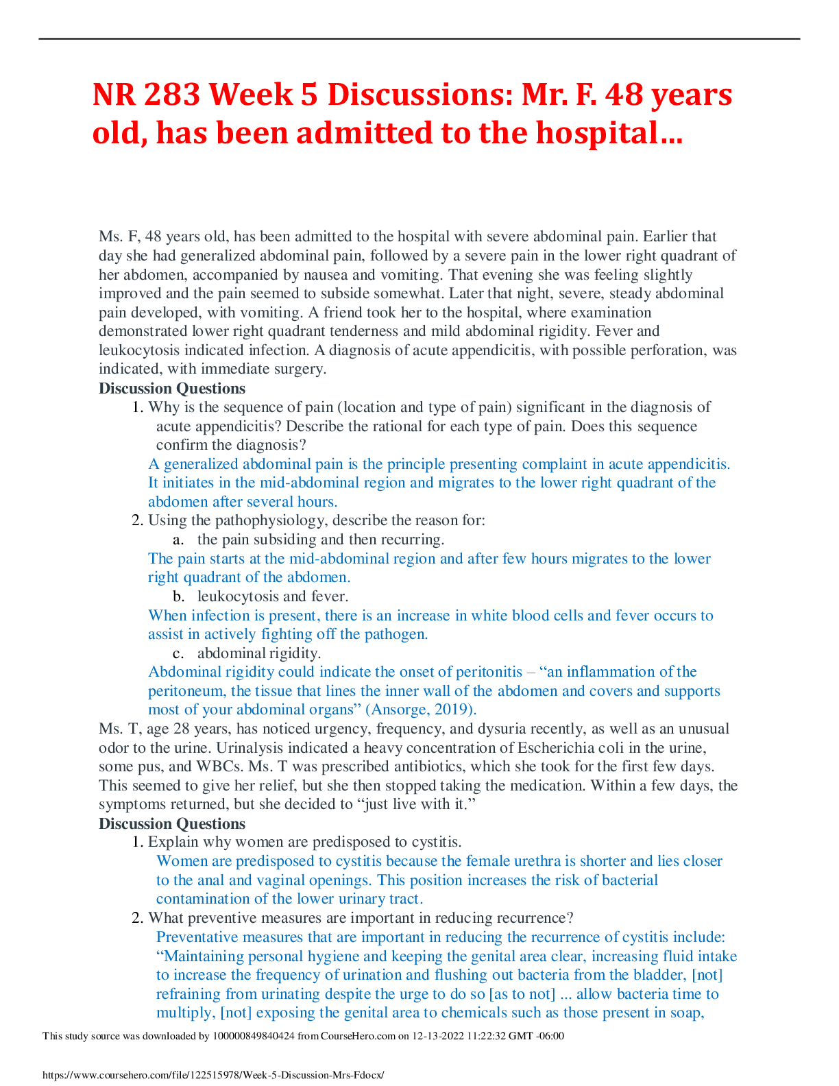 Pathophysiology > DISCUSSION POST > [GRADED] NR 283 Week 5 Discussions: Mr. F. (48 years old, has been admitted to the hospital…) (All)