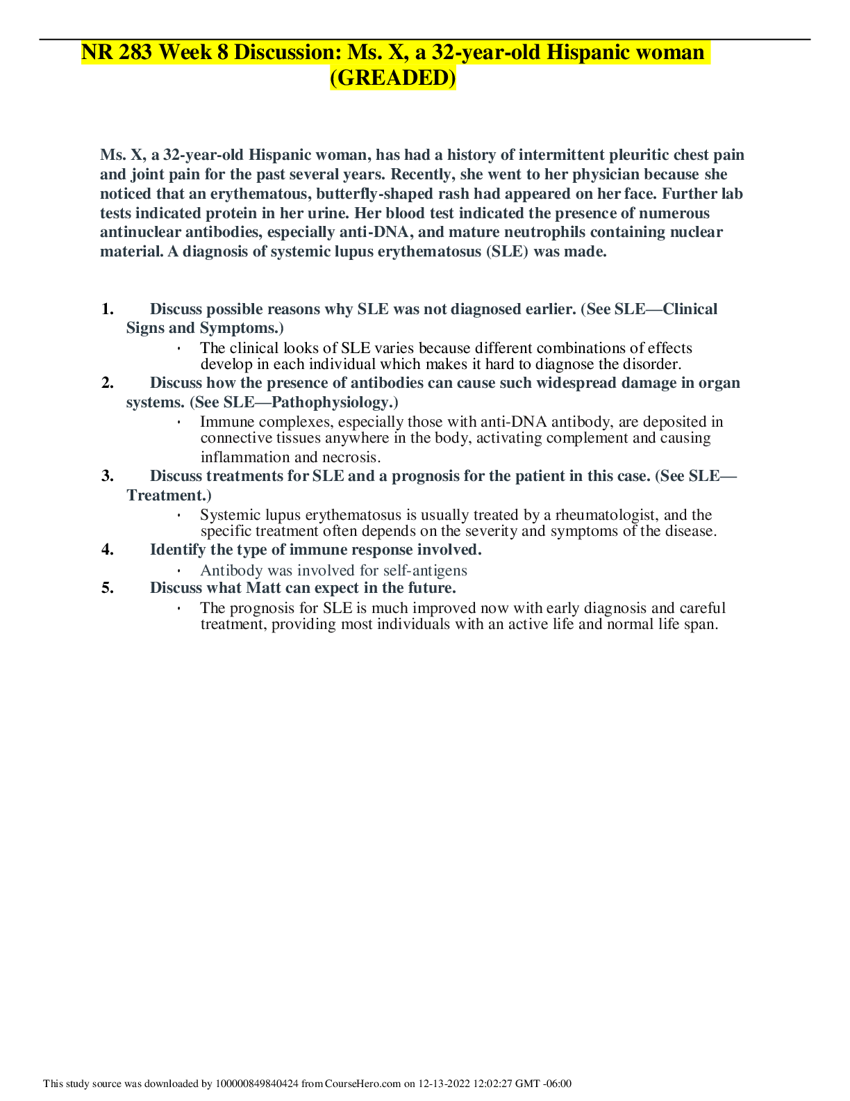 Pathophysiology > DISCUSSION POST > NR 283 Week 8 Discussions: Ms. X, a 32-year-old Hispanic woman (GRADED A) (All)