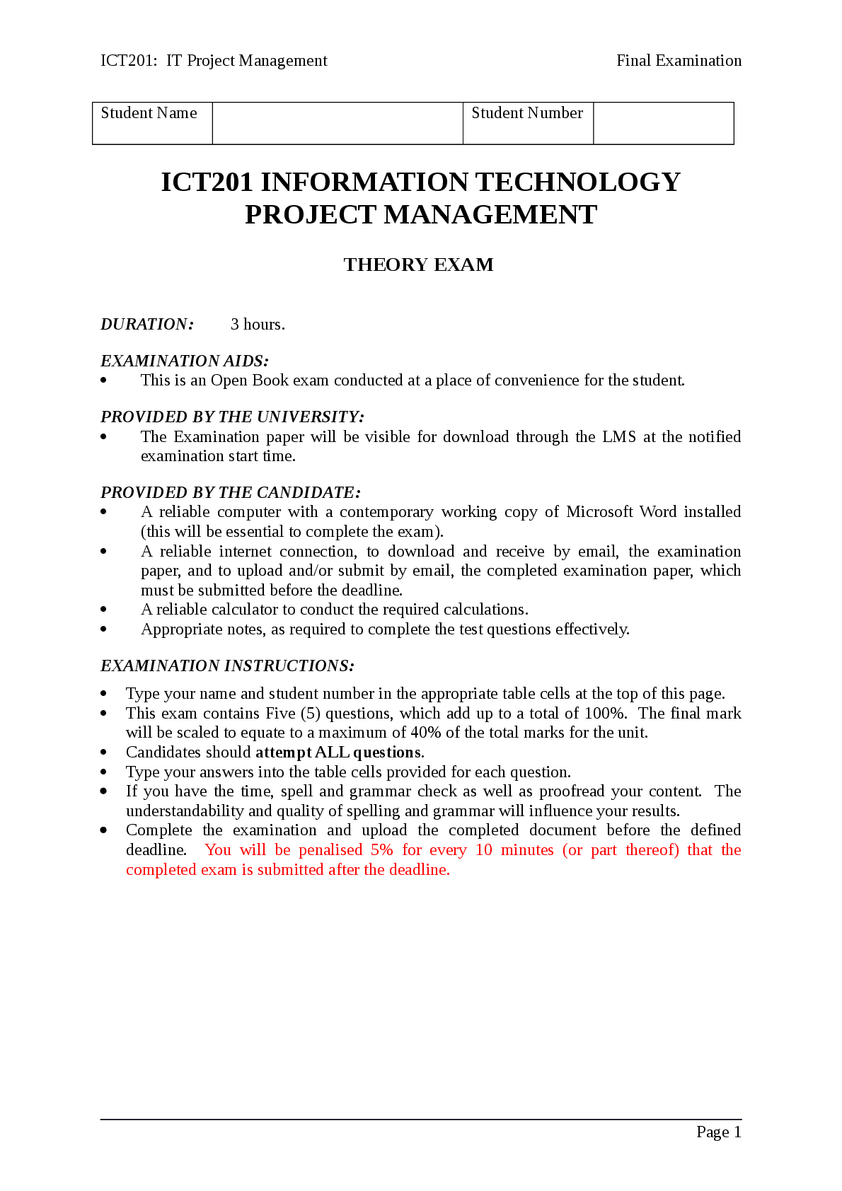 Information Technology > EXAM > ICT201 INFORMATION TECHNOLOGY PROJECT MANAGEMENT (All)