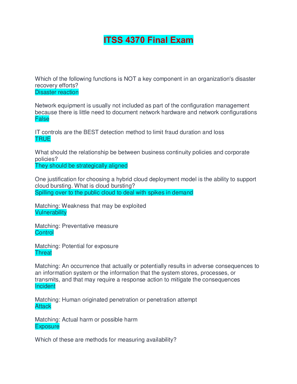 Information Technology > EXAM > ITSS 4370 Final Exam | Questions and Answers (All)