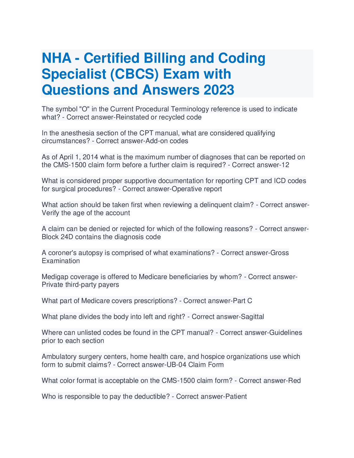 Information Technology > EXAM > NHA - Certified Billing and Coding Specialist (CBCS) Exam with Questions and Answers 2023 (All)