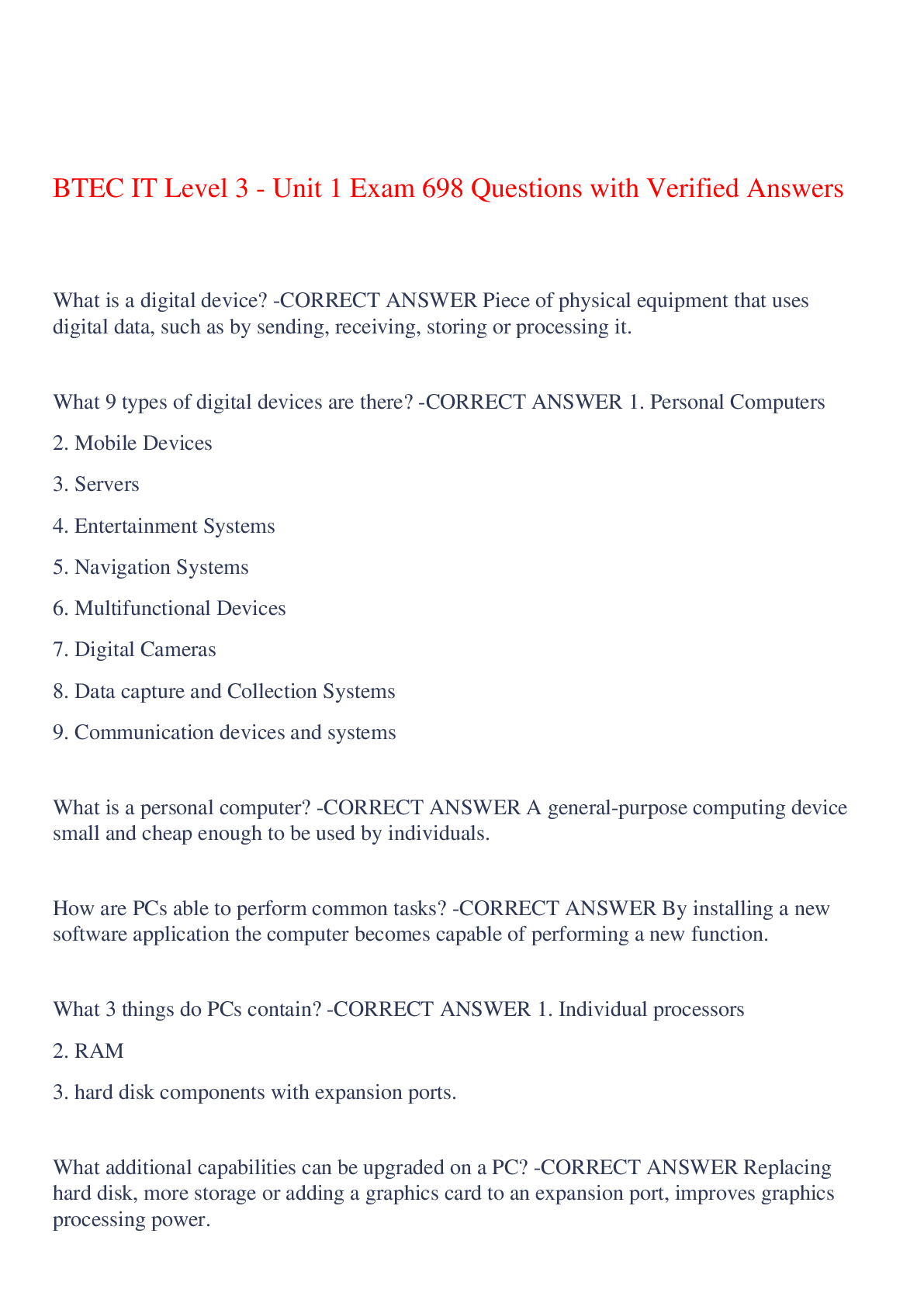 Information Technology > EXAM > BTEC IT Level 3 - Unit 1 Exam 698 Questions with Verified Answers,100% CORRECT (All)