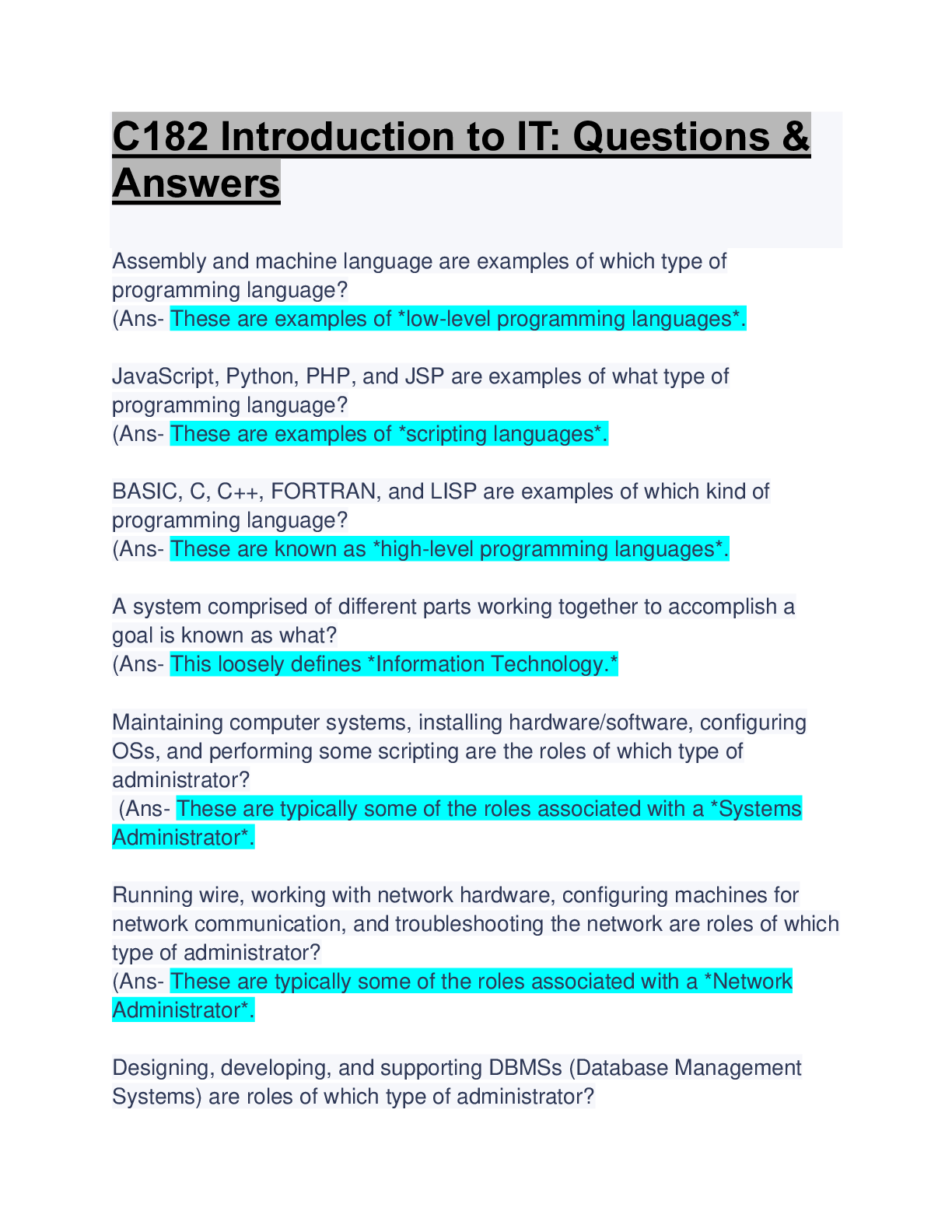 Information Technology > EXAM > C182 Introduction to IT: Questions & Answers: WGU C182 Introduction to IT:Updated Solution (All)