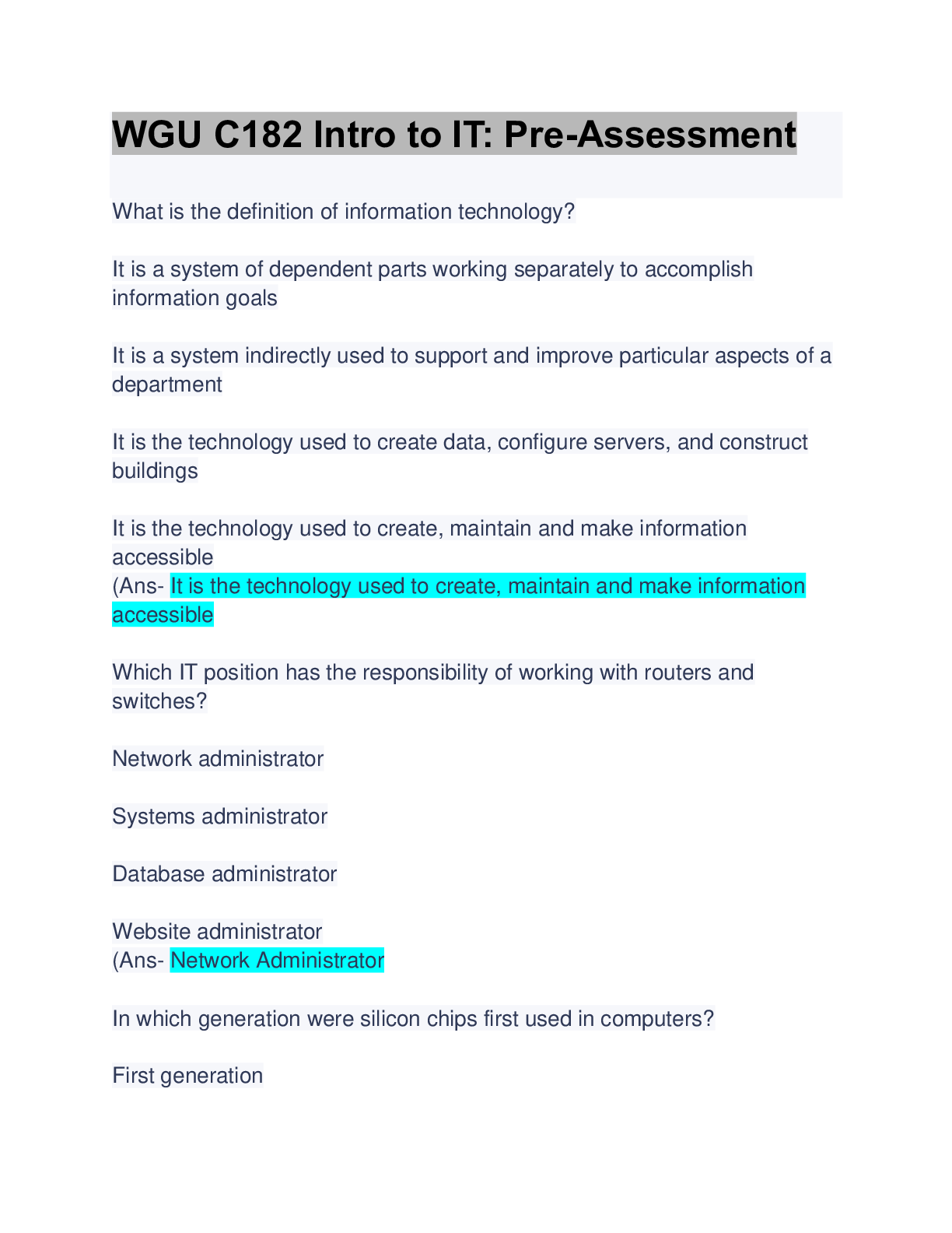 Information Technology > EXAM > C182 Introduction to IT WGU Pre-Assessment: Questions & Answers (All)
