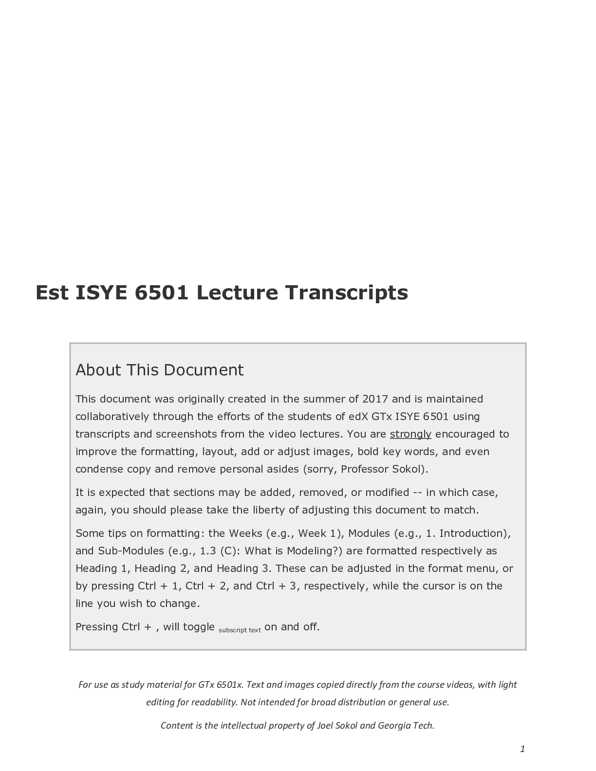 Information Technology > LECTURE SLIDES/NOTES > Georgia Institute Of Technology ISYE 6501 Introduction To Analytics Modeling - GTX ISYE 6501 Lecture Transcripts (Complete Solution) (All)
