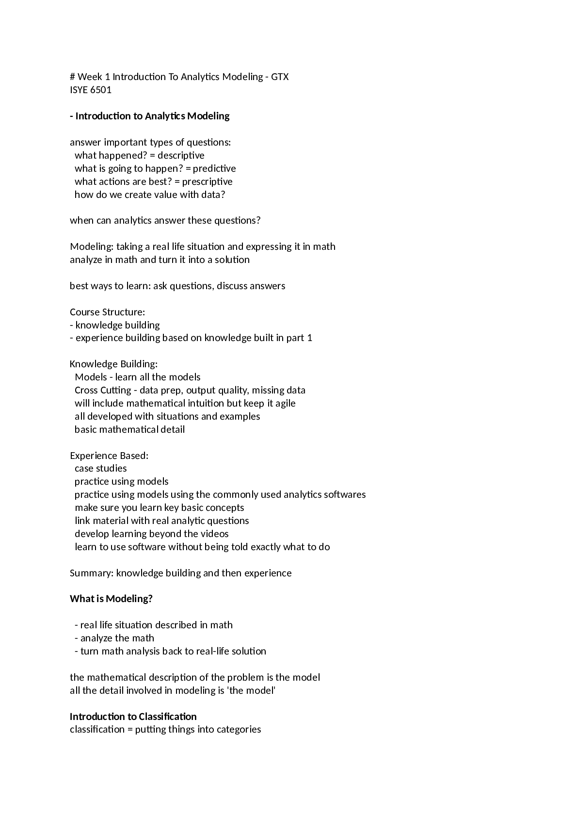 Information Technology > LECTURE SLIDES/NOTES > Georgia Institute Of Technology ISYE 6501 Lecture Notes ISYE 6501 Midterm 1 - Introduction To Analytics Modeling - GTX ISYE 6501 (All)