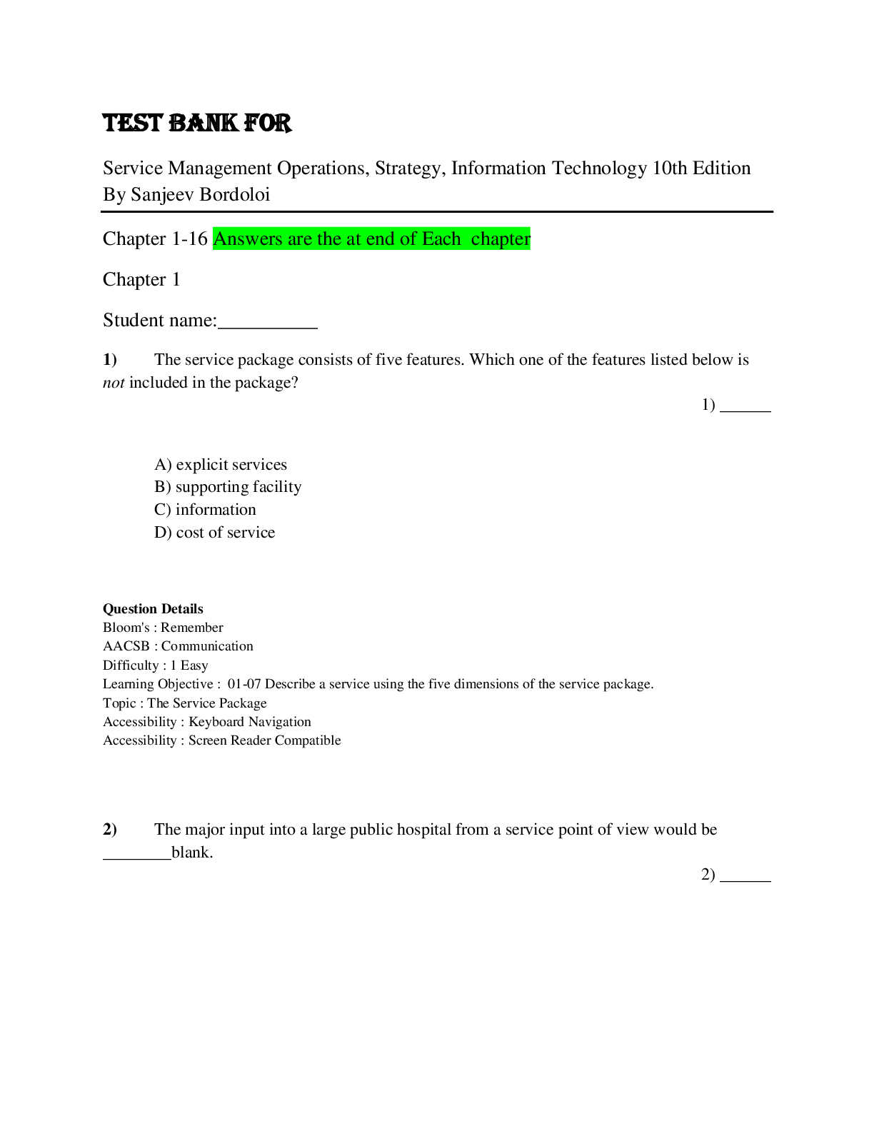 Information Technology > TEST BANKS > Test Bank for Service Management Operations, Strategy, Information Technology 10th Edition By Sanjeev Bordoloi (All)