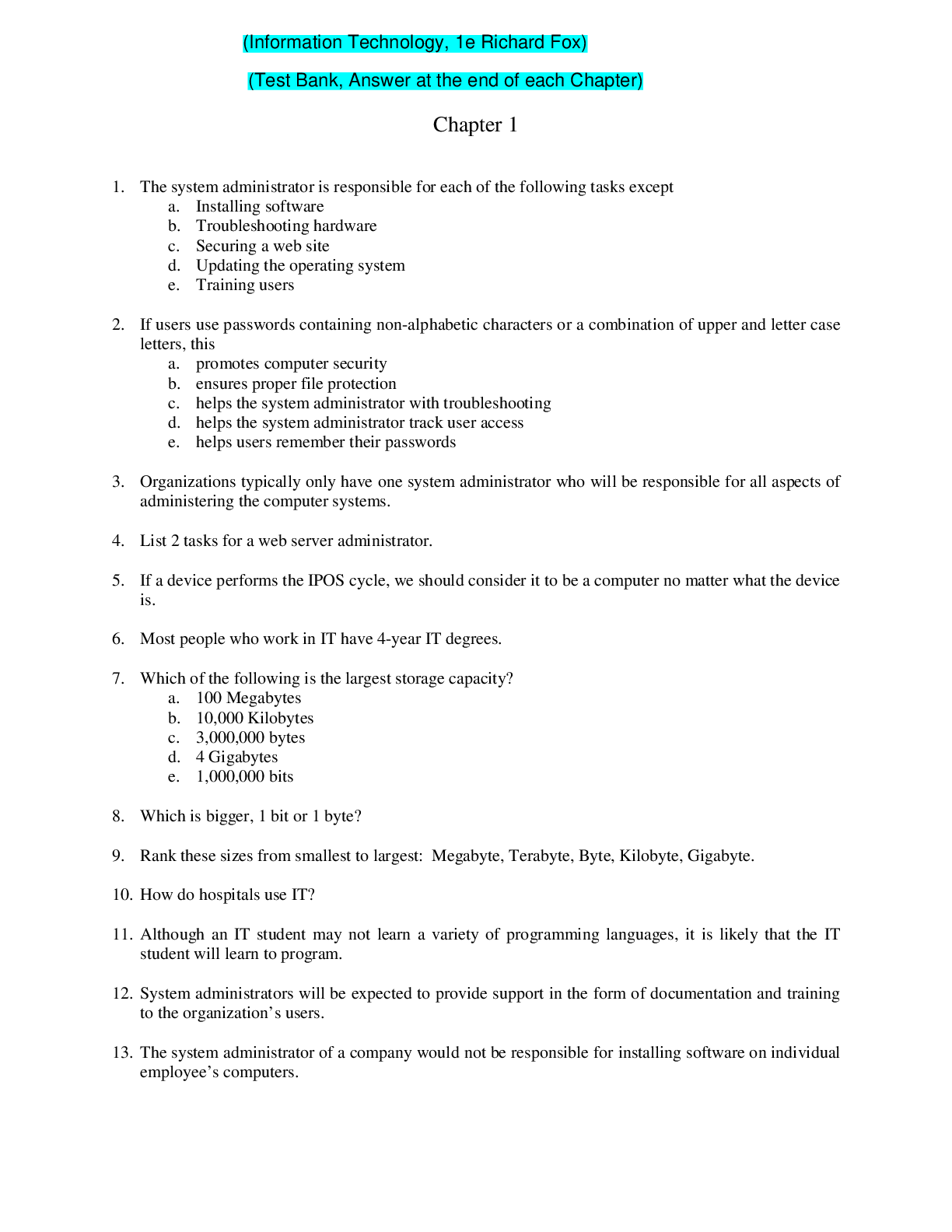 Information Technology > TEST BANKS > Information Technology, 1e Richard Fox (Test Bank) (All)