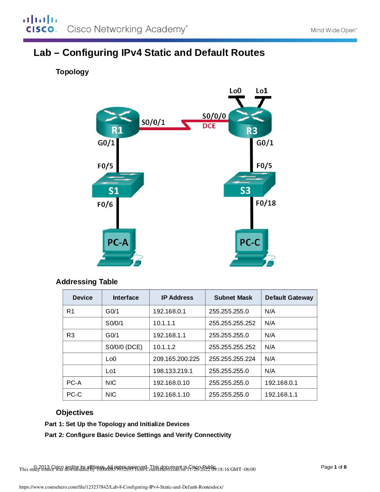 Information Technology > Lab Experiment > Lab 8 - Configuring IPv4 Static and Default Routes. (All)