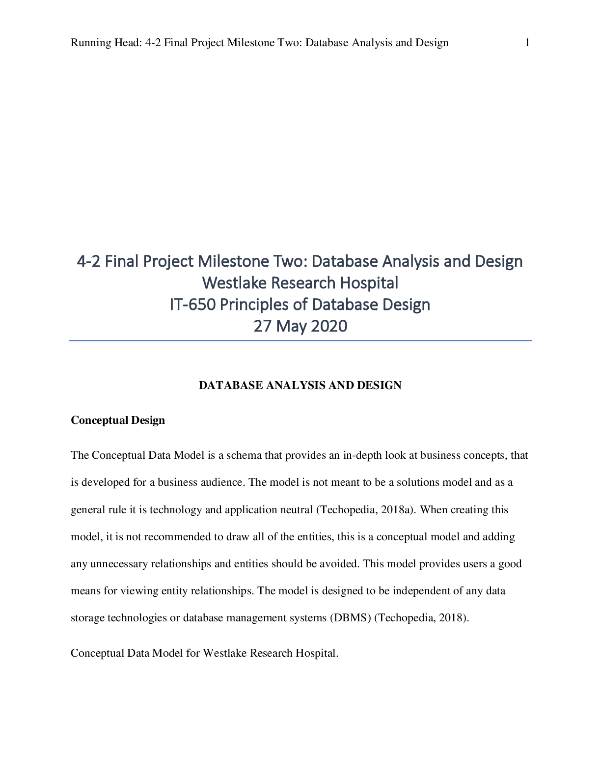 Information Technology > PROJECT FINAL > 4-2 Final Project Milestone Two: Database Analysis and Design Westlake Research Hospital IT-650 Principles of Database Design 27 May 2020 (All)