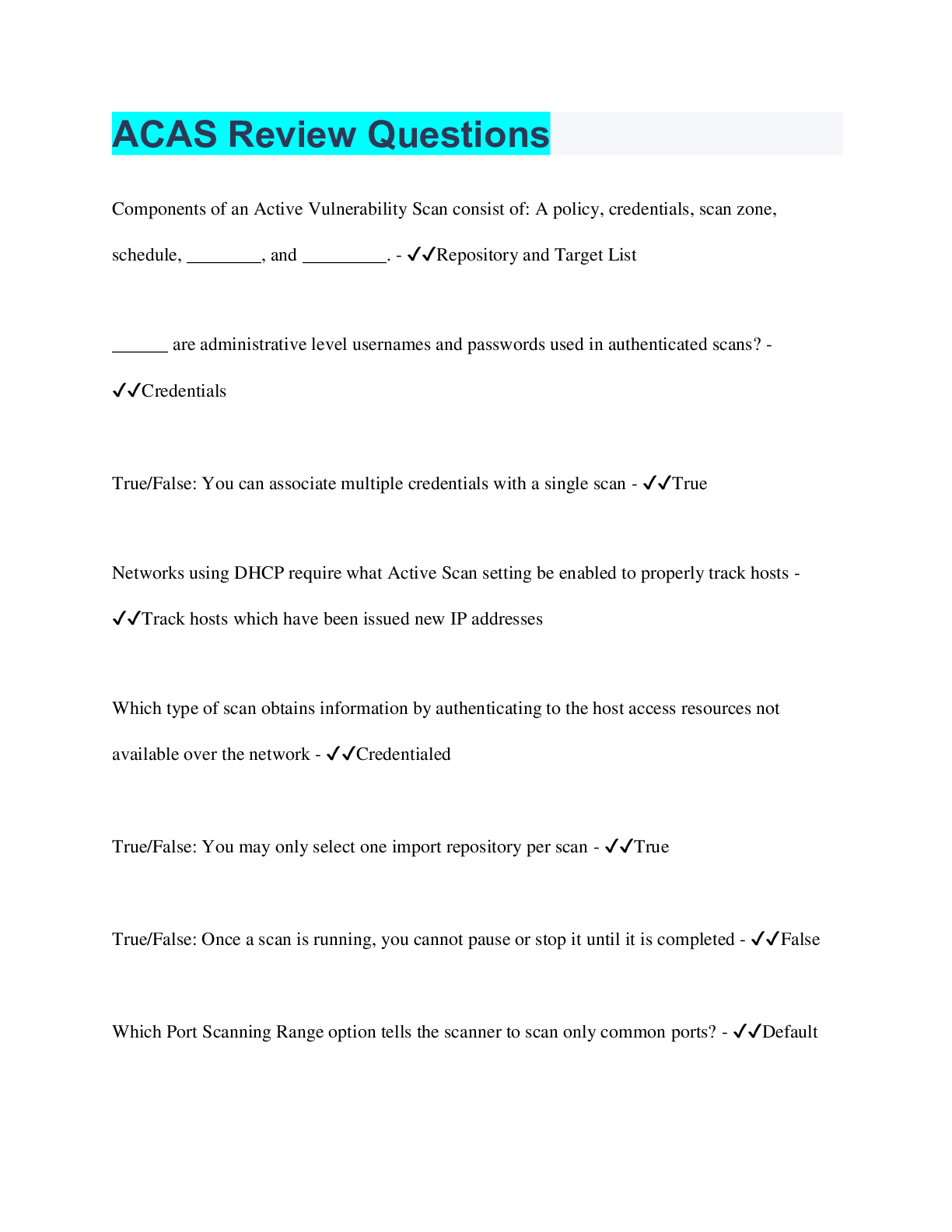 Information Technology > EXAM > ACAS - 5.3 Course Study Guide | 109 Questions with 100% Correct Answers | Verified (All)