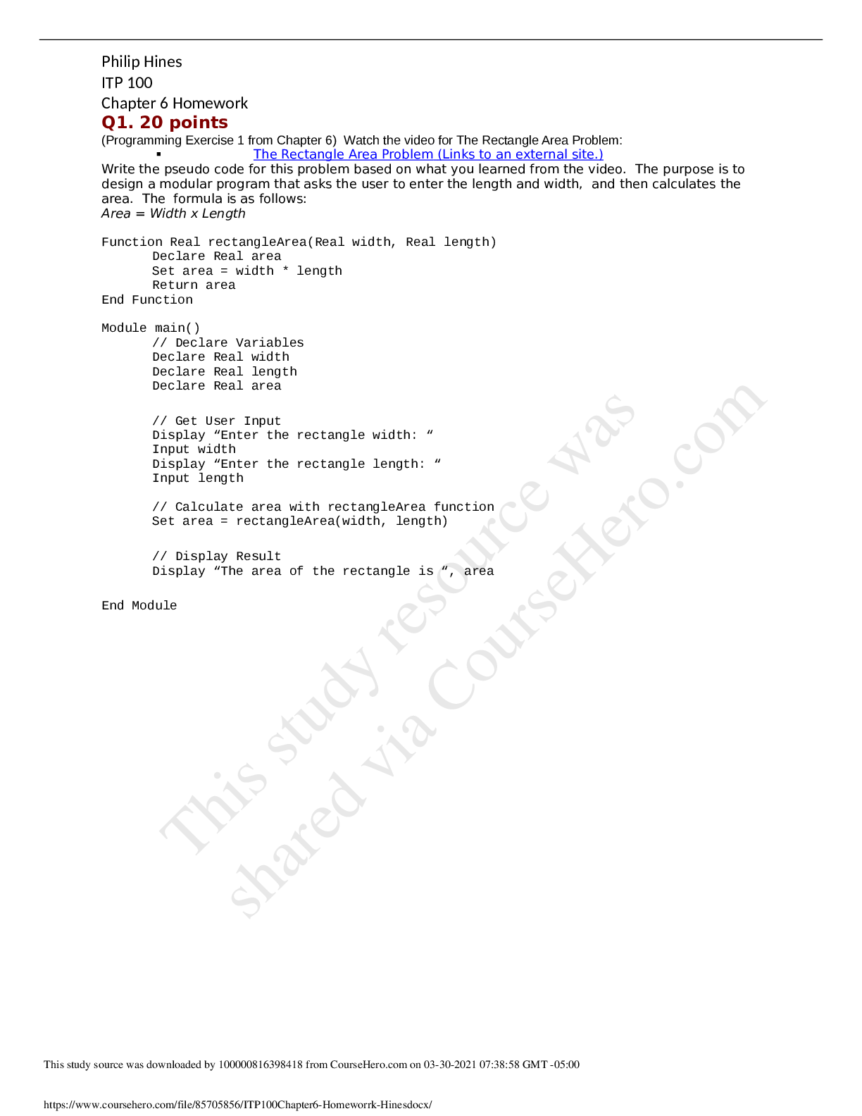 Information Technology > Research Paper > Northern Virginia Community CollegeITPITP 100ITP100Chapter6_Homeworrk_Hines.docx - Philip Hines ITP 100 Chapter 6 Homework Q1 20 points(Programming Exercise 1 from Chapter 6 Watch the video for The (All)
