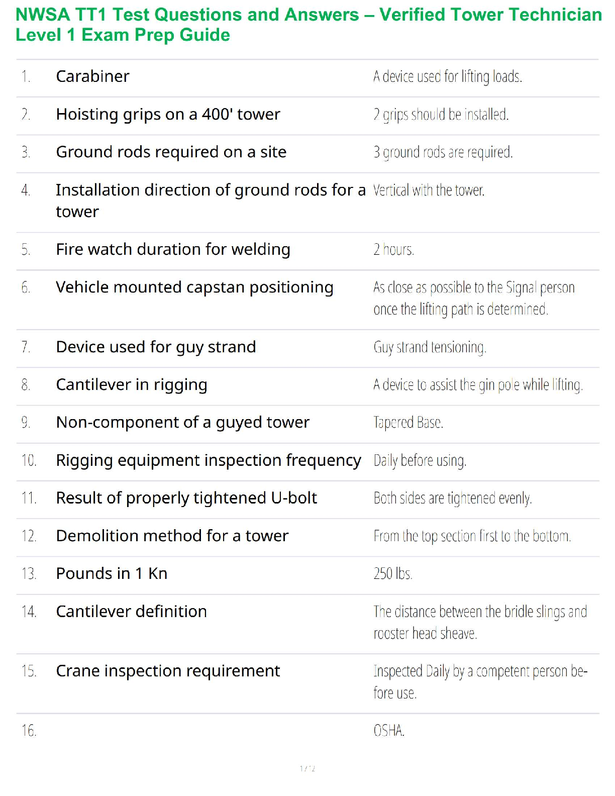 Information Technology > QUESTIONS & ANSWERS > NWSA TT1 Test Questions and Answers – Verified Tower Technician Level 1 Exam Prep Guide (All)