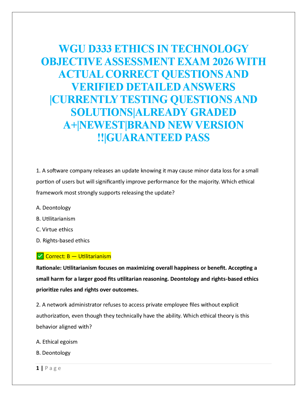 Information Technology > EXAM > WGU D333 ETHICS IN TECHNOLOGY OBJECTIVE ASSESSMENT EXAM 2026 (All)