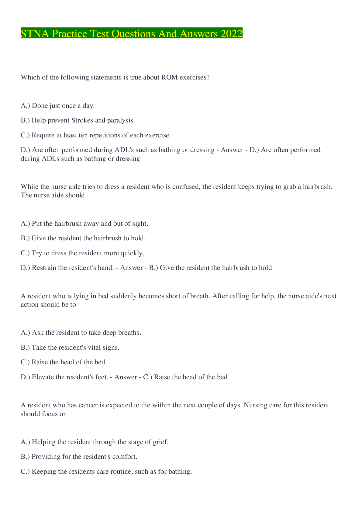Information Technology > QUESTIONS & ANSWERS > STNA Practice Test Questions And Answers 2022 (All)