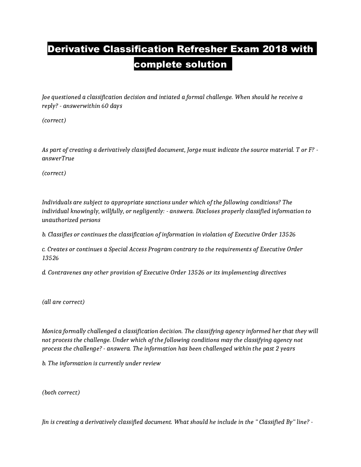 Information Technology > QUESTIONS & ANSWERS > Derivative Classification Refresher Exam 2018 with complete solution (All)