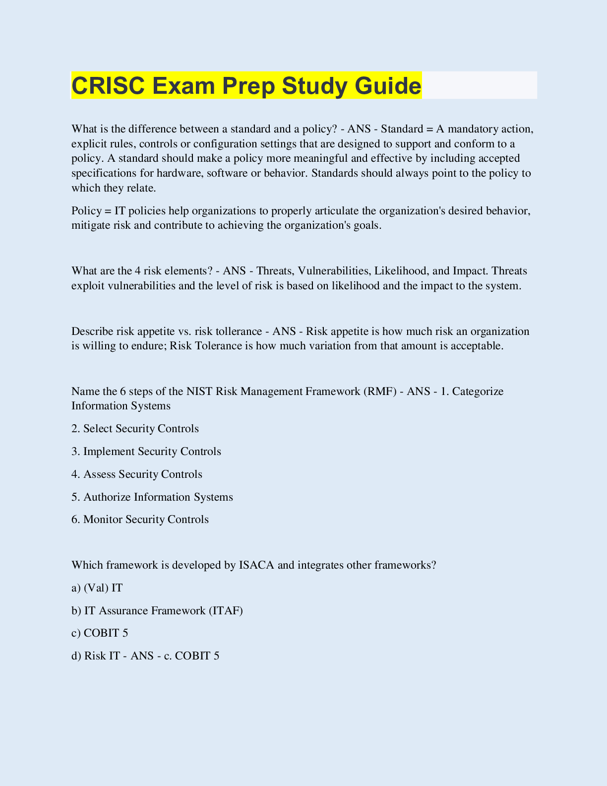 Information Technology > QUESTIONS & ANSWERS > CRISC Exam Prep Study Guide (All)