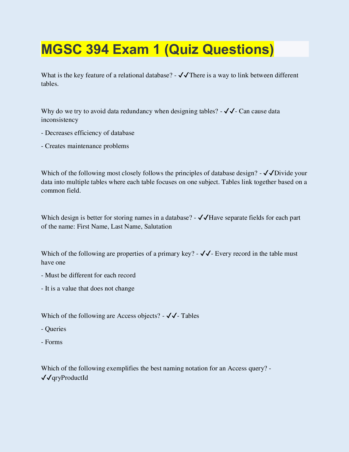 Information Technology > EXAM > MGSC 394 Exam 1 (Quiz Questions) | 40 Questions with 100% Correct Answers | Updated & Verified (All)