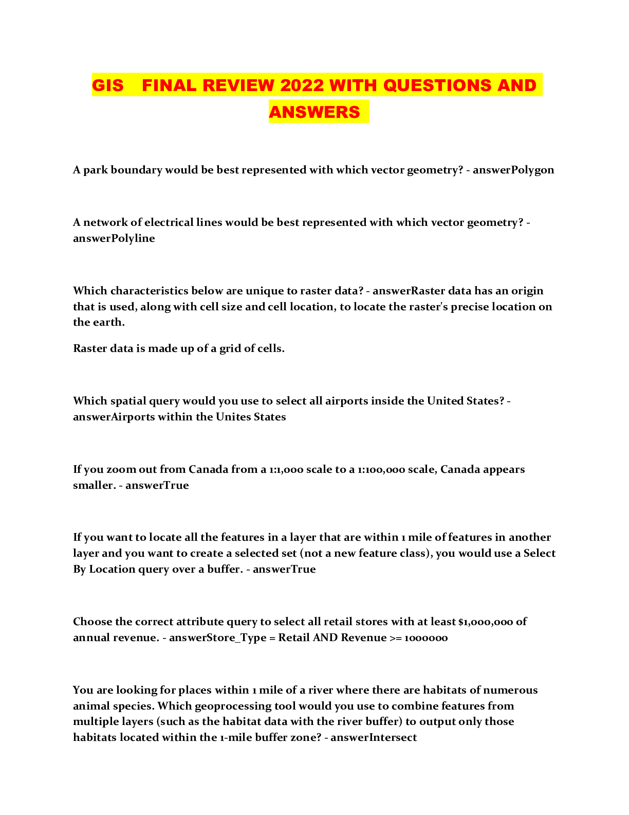 Information Technology > QUESTIONS & ANSWERS > GIS FINAL REVIEW 2022 WITH QUESTIONS AND ANSWERS (All)