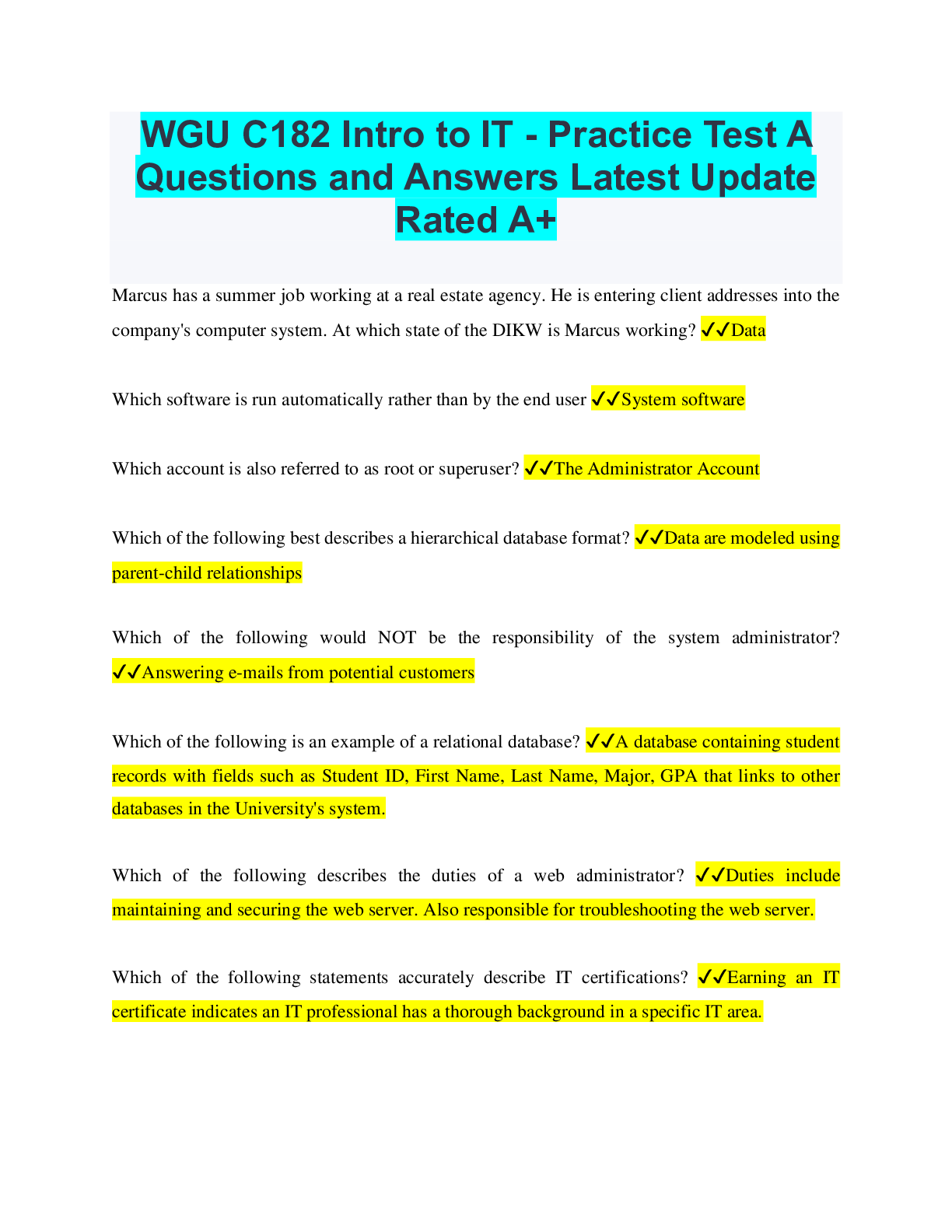 Information Technology > QUESTIONS & ANSWERS > WGU C182 Intro to IT - Practice Test A Questions and Answers Latest Update Rated A+ (All)