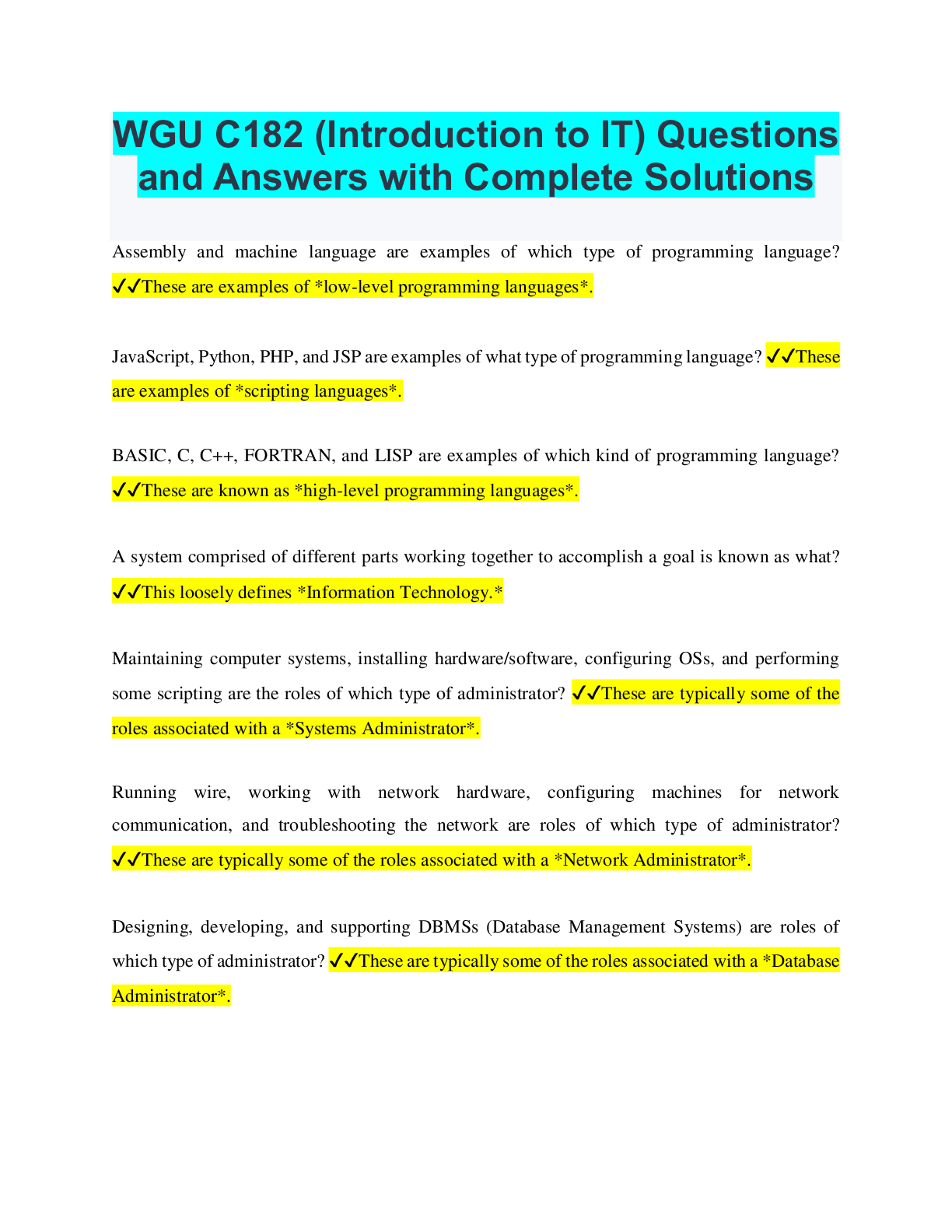 Information Technology > QUESTIONS & ANSWERS > WGU C182 (Introduction to IT) Questions and Answers with Complete Solutions (All)