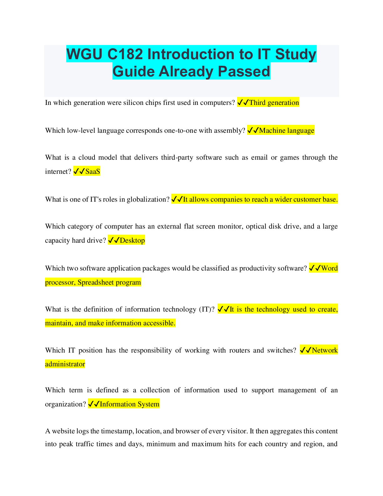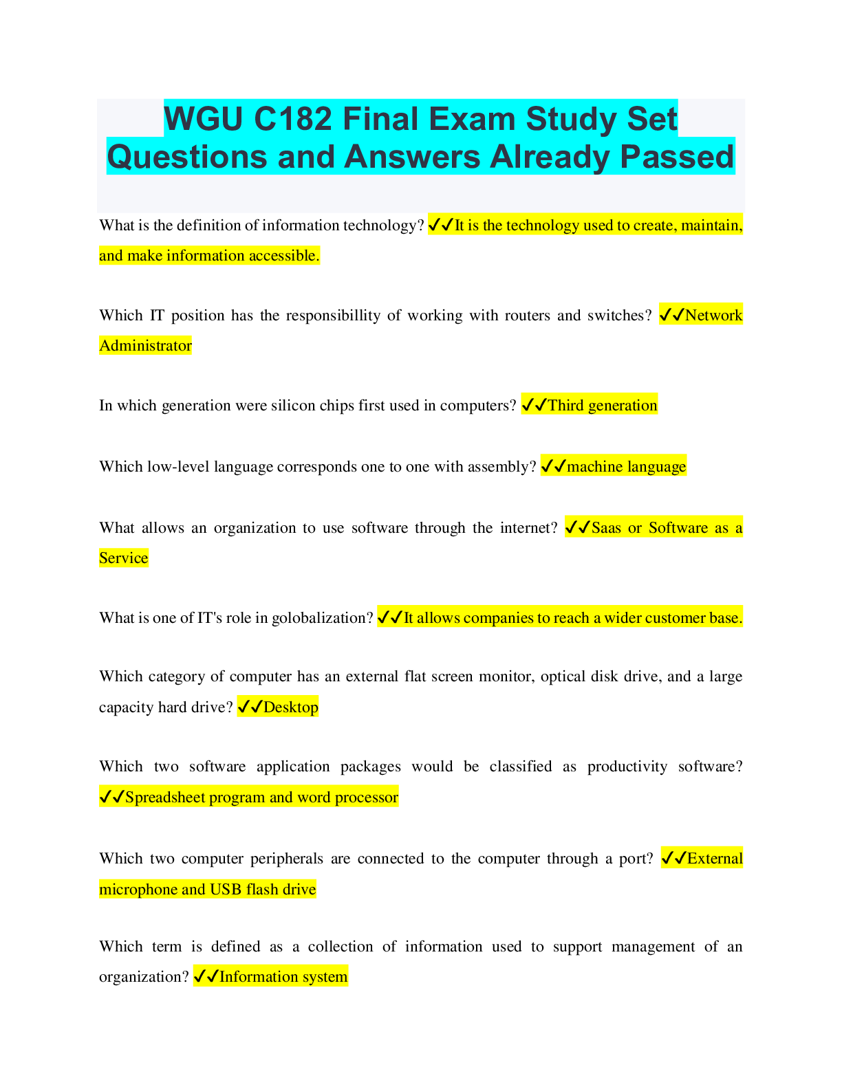 Information Technology > QUESTIONS & ANSWERS > WGU C182 Introduction to IT Study Guide Already Passed (All)