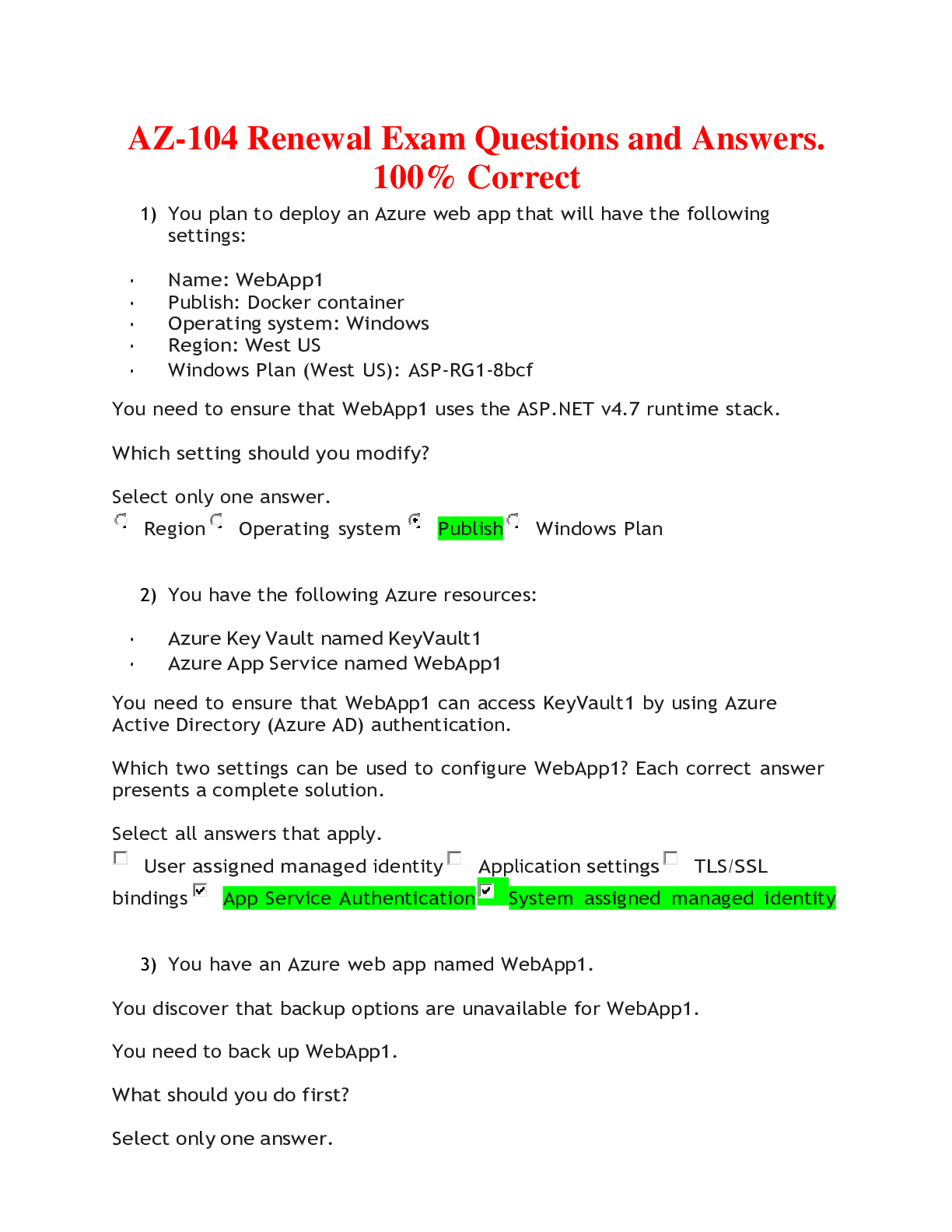 Information Technology > QUESTIONS & ANSWERS > AZ-104 Renewal Exam Questions and Answers. 100% Correct (All)