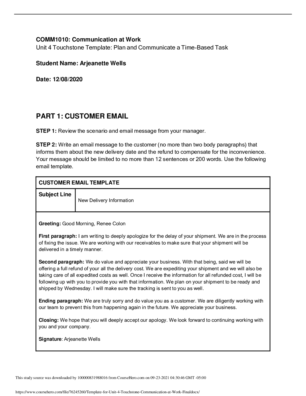Communication > Summary > Template for Unit 4 Touchstone - Communication at Work Final / Communication at Work Touchstone Plan and Communicate a Time-Based Task Sophia Course (answered) (All)