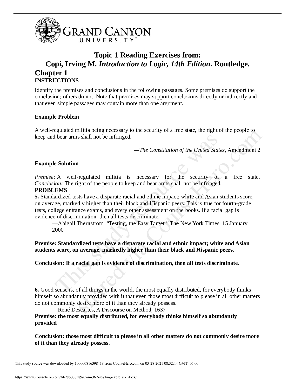 Communication > Study Notes > Grand Canyon University - COM-362 COM 362Com 362 reading exercise 1. Topic 1 Reading Exercises from: Copi, Irving M. Introduction to Logic, 14th Edition. Routledge (All)