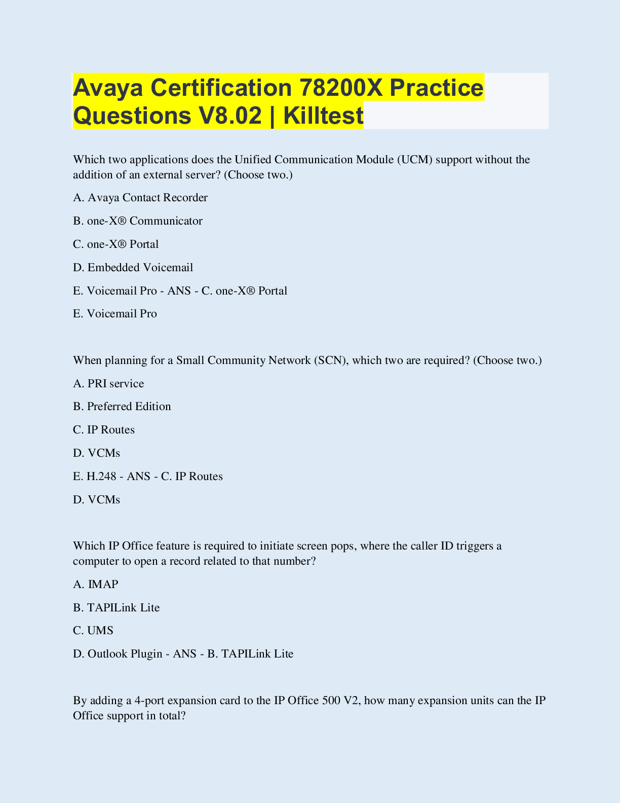 Communication > EXAM > Avaya Certification 78200X Practice Questions V8.02 | Killtest | with 100% Correct Answers | Updated & Verified (All)