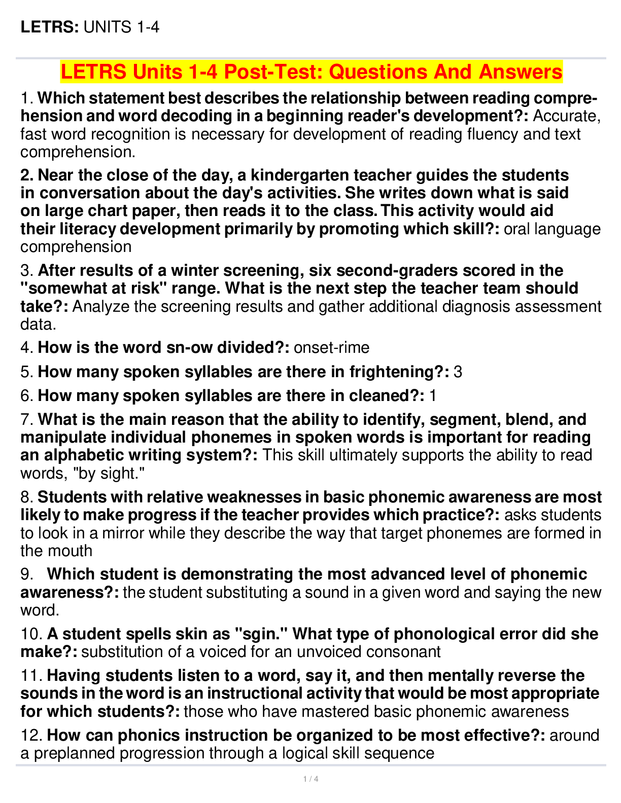 Communication > EXAM > LETRS Units 1-4 Post-Test: Questions And Answers 2022/2023 (All)