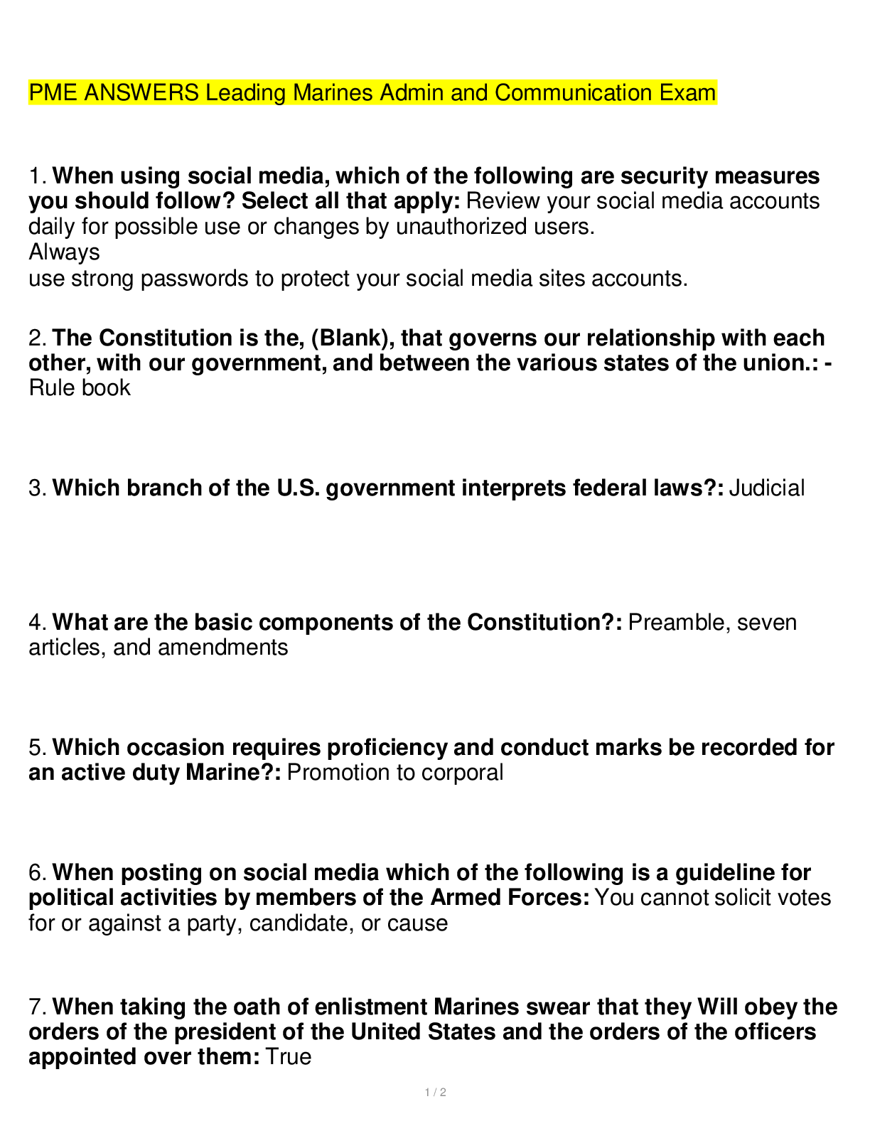 Communication > EXAM > PME ANSWERS Leading Marines Admin and Communication Exam Spring 2023. (All)