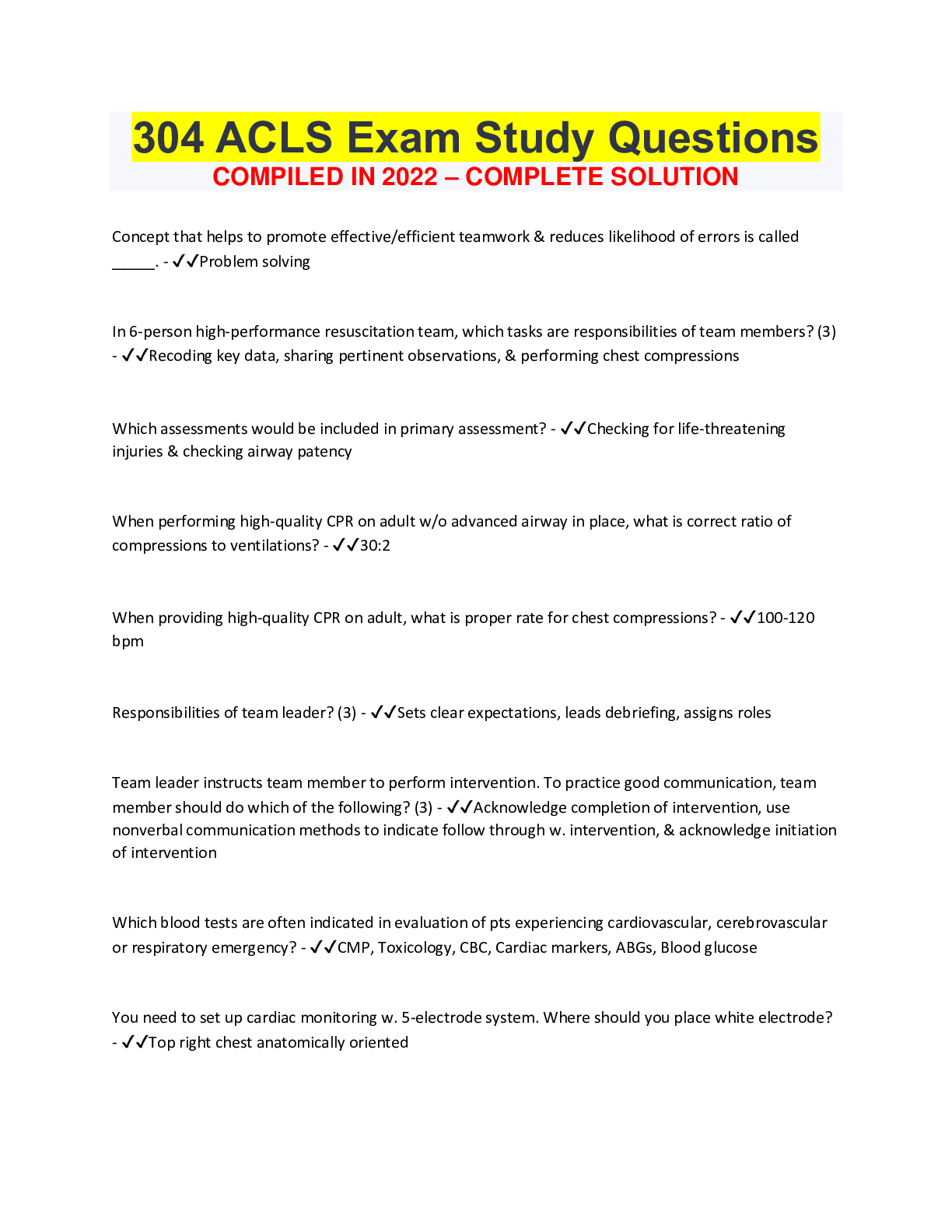 Communication > EXAMs > 304 ACLS Exam Study Questions COMPILED IN 2022 – COMPLETE SOLUTION (All)