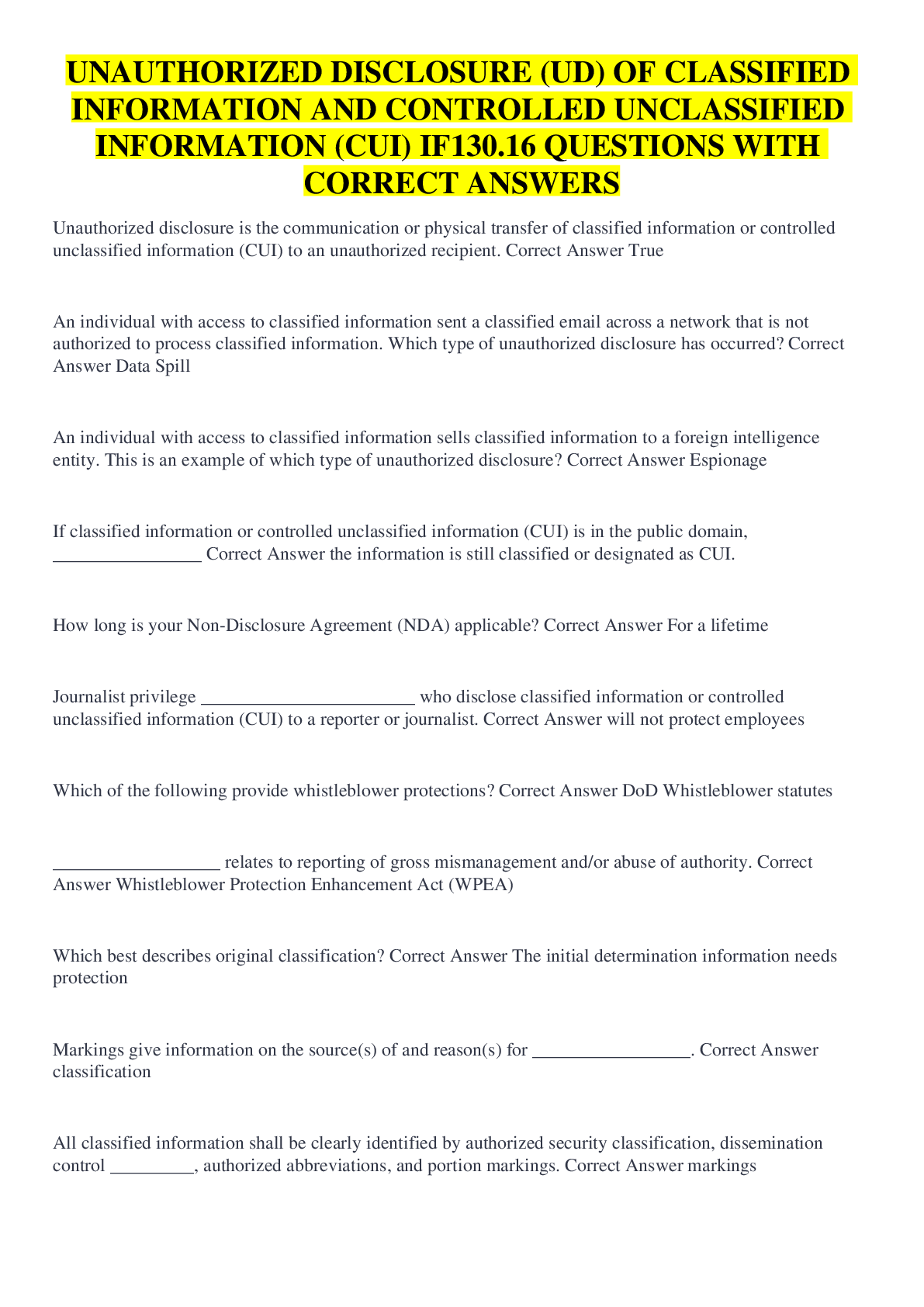 Communication > QUESTIONS & ANSWERS > UNAUTHORIZED DISCLOSURE (UD) OF CLASSIFIED INFORMATION AND CONTROLLED UNCLASSIFIED INFORMATION (CUI) IF130.16 QUESTIONS WITH CORRECT ANSWERS (All)