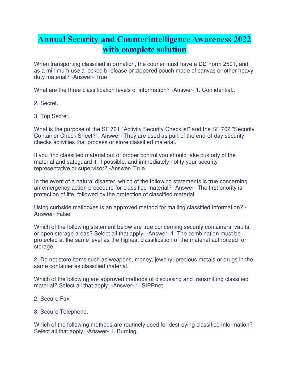 Government > EXAM > Annual Security and Counterintelligence Awareness 2022 with complete solution (All)