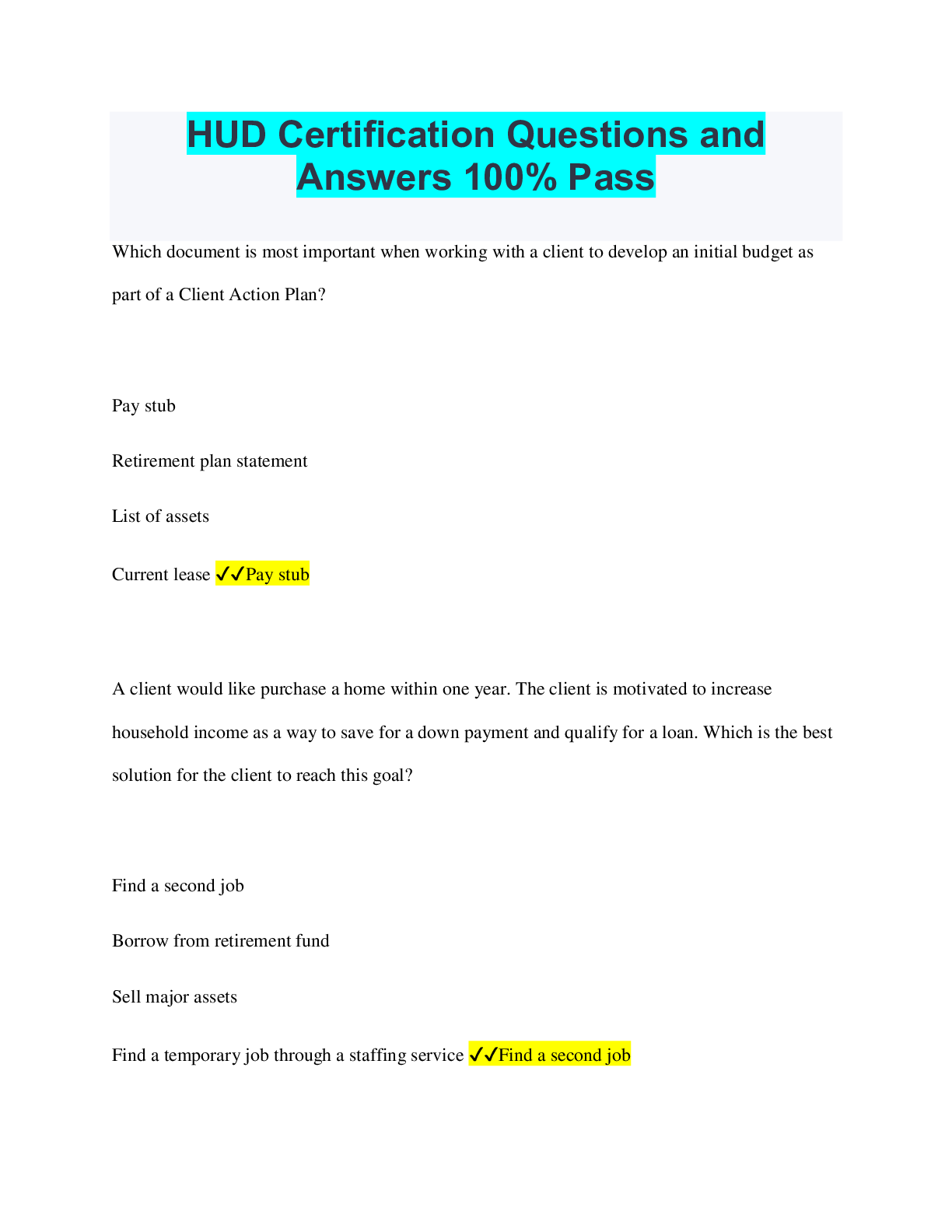 Urban Studies > QUESTIONS & ANSWERS > HUD Certification Questions and Answers 100% Pass (All)
