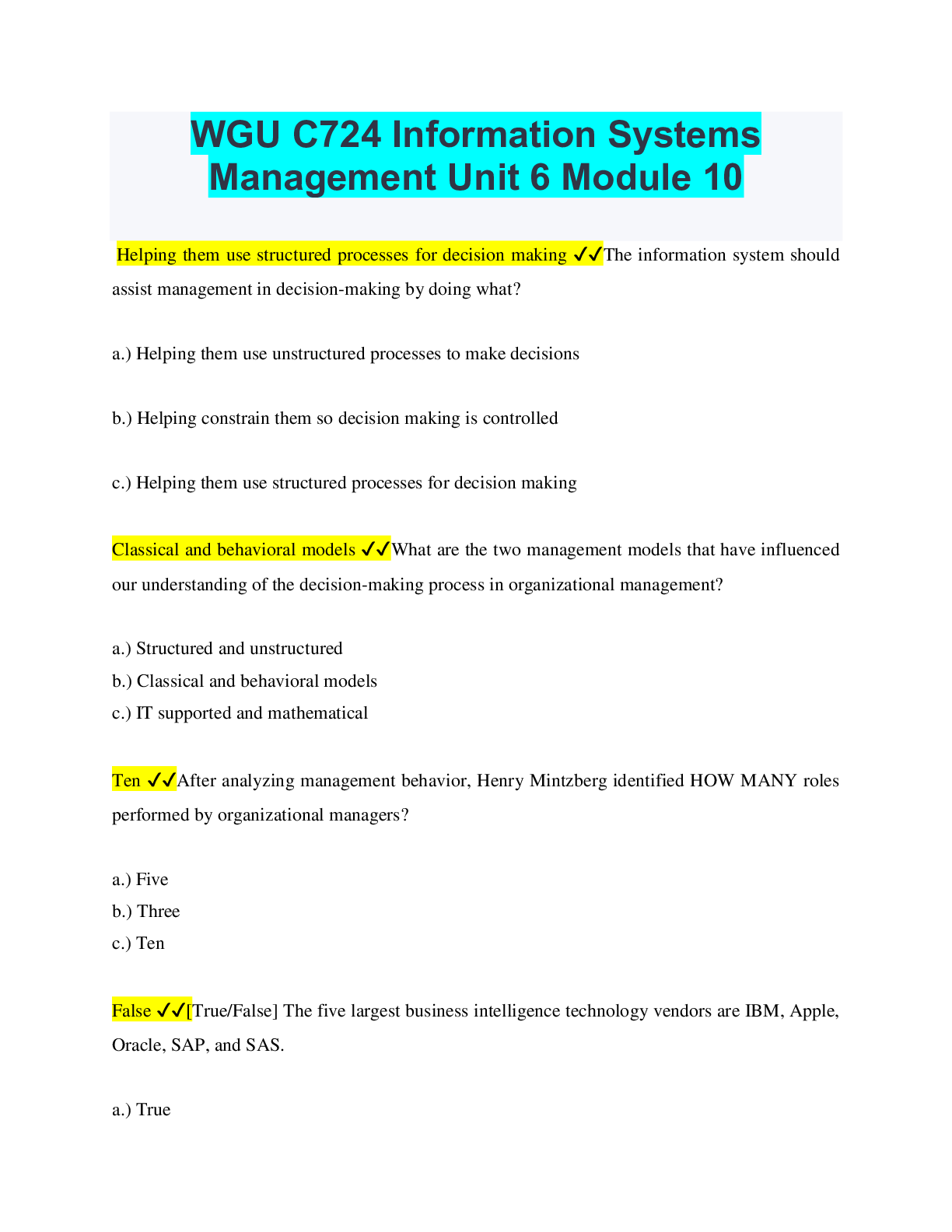 Management Information Systems (MIS) > QUESTIONS & ANSWERS > WGU C724 Information Systems Management Unit 6 Module 10 (All)