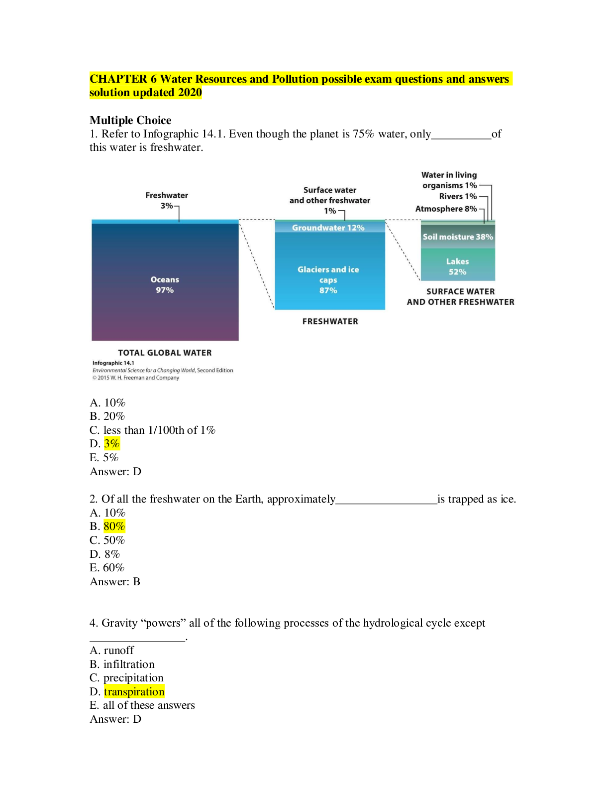 Environmental Science > QUESTIONS & ANSWERS > CHAPTER 6 Water Resources and Pollution possible exam questions and answers solution updated 2020 (All)