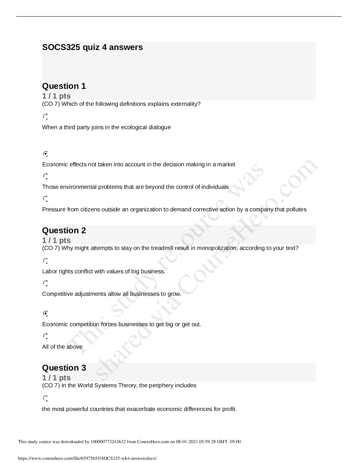 Environmental Science > QUESTIONS & ANSWERS > SOCS325 -environmental studies week 4 quiz and answers (All)