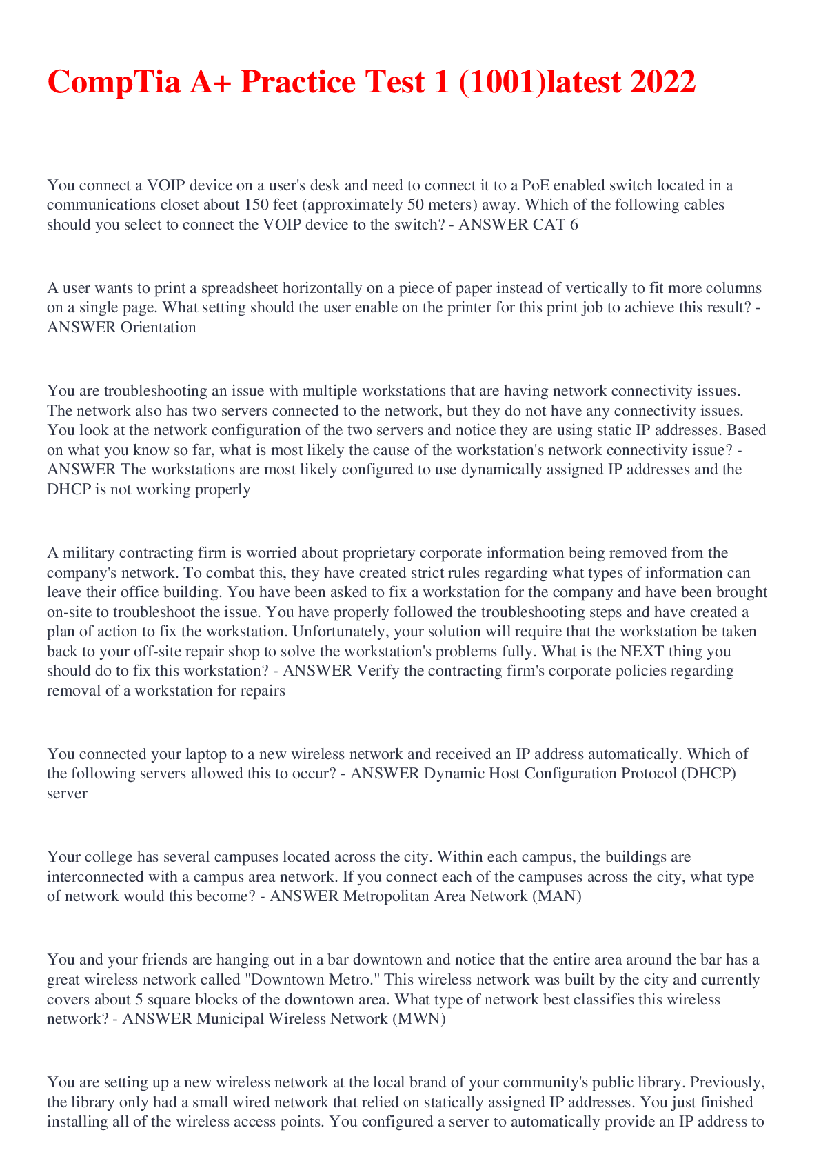 Computer Science > EXAM > CompTia A+ Practice Test 1 (1001)latest 2022 (All)