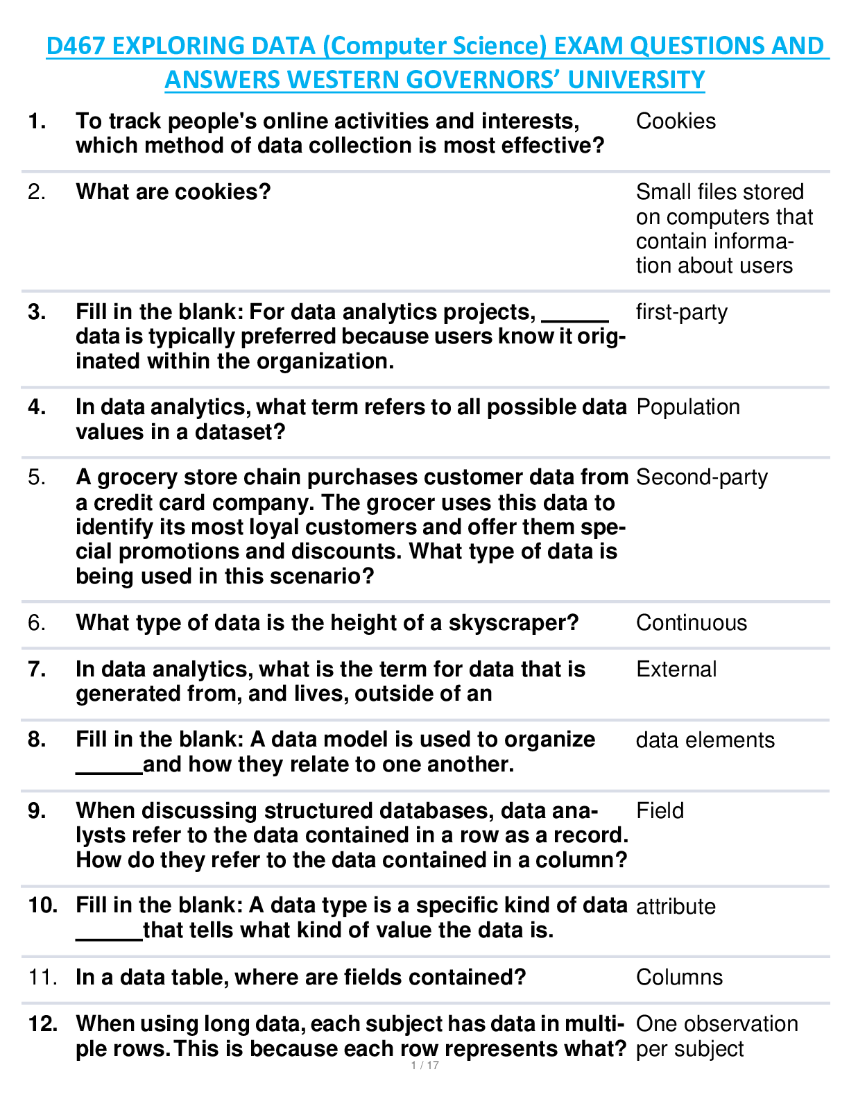 Computer Science > EXAM > D467 EXPLORING DATA (Computer Science) EXAM QUESTIONS AND ANSWERS WESTERN GOVERNORS’ UNIVERSITY (All)