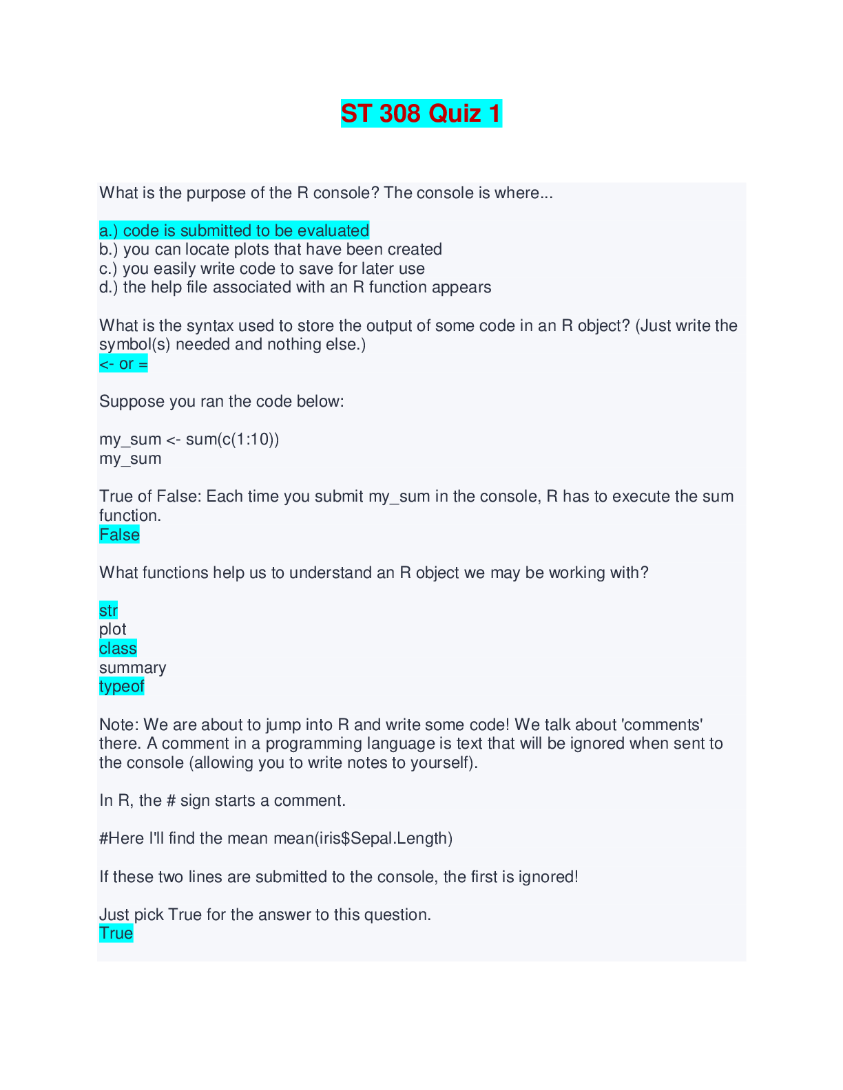 Computer Science > EXAM > ST 308 Quiz 1 | Questions and Answers (All)
