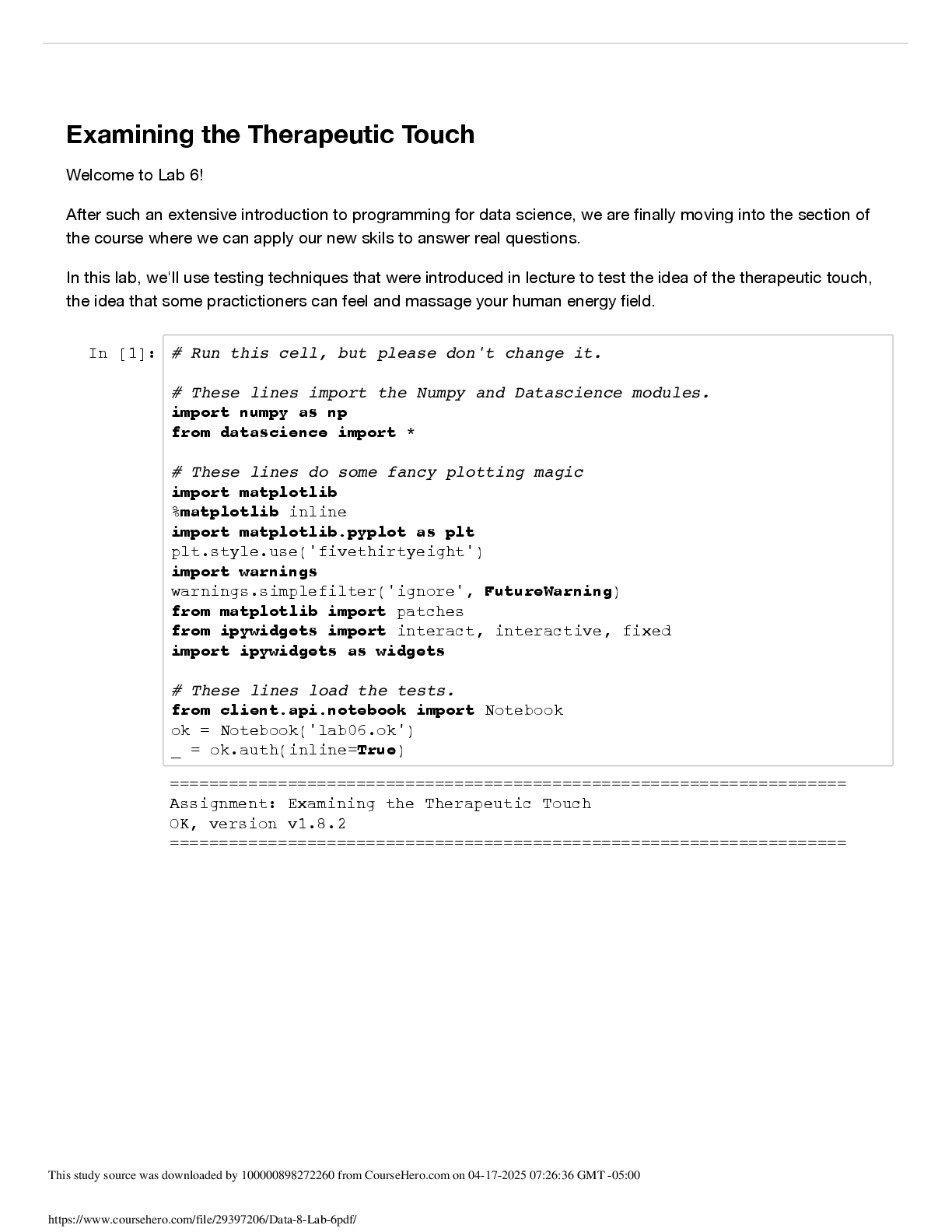 Computer Science > EXAM > Data C8 Lab 6: Examining the Therapeutic Touch | Spring 2025, Complete Solutions (All)