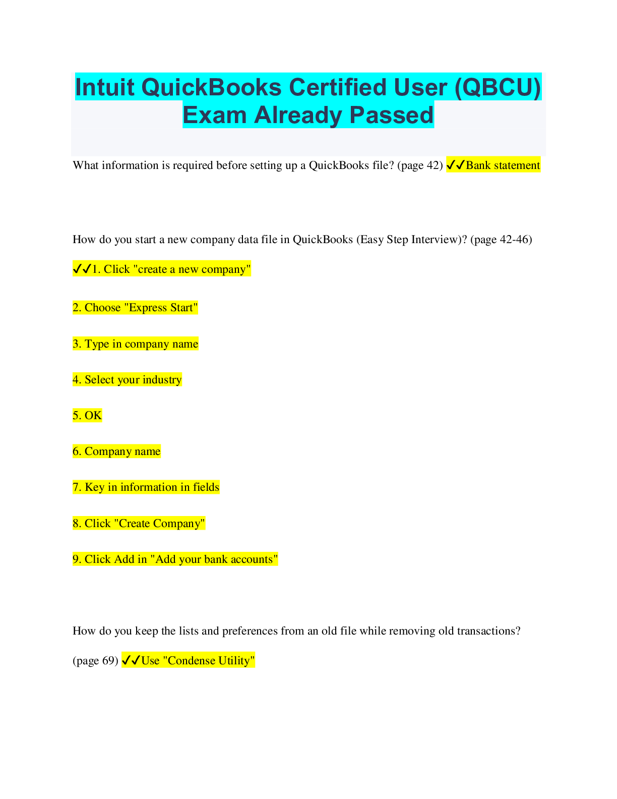 Computer Science > QUESTIONS & ANSWERS > Intuit QuickBooks Certified User (QBCU) Exam Already Passed (All)